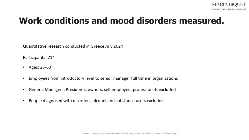Η μελέτη αυτή πραγματοποιήθηκε με σκοπό να εντοπίσουμε τις συνθήκες εργασίας που συσχετίζονται με την ψυχική ευημερία των εργαζόμενων. Καθώς το αντικείμενό μας είναι να σχεδιάζουμε και εφαρμόζουμε ατομικές ή ομαδικές παρεμβάσεις, μπορούμε να χρησιμοποιήσουμε εργαλεία από την Νευροψυχολογία για να προστατεύσουν την ψυχική υγεία στην εργασία.