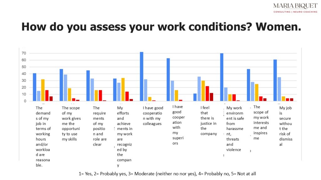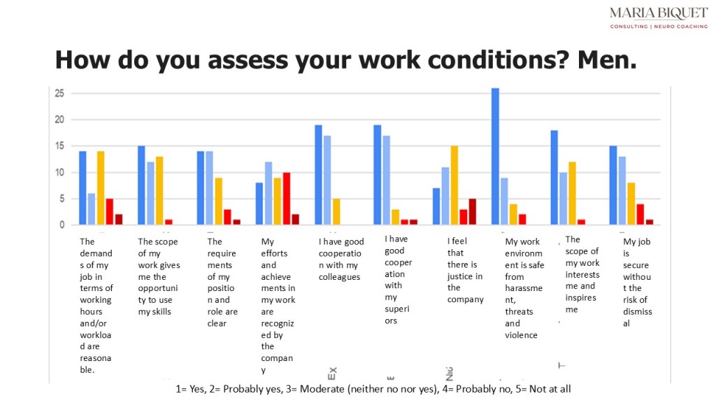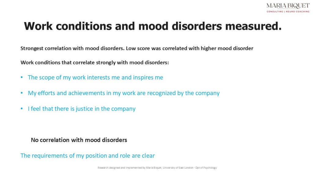 – ισχυρή συσχέτιση των διαστάσεων : “Ενδιαφέρον για το αντικείμενο εργασίας”, “Δικαιοσύνη” και “Αναγνώριση” με τις διαταραχές διάθεσης εξίσου σε άνδρες και γυναίκες, και συγκεκριμένα, η χαμηλή ικανοποίηση στην συνθήκη συσχετίζεται με διαταραχές διάθεσης, από ήπια κατάθλιψη έως οριακή και μέτρια κατάθλιψη σύμφωνα με τους δείκτες.